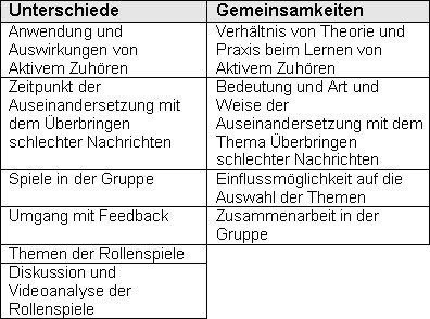 An dieser Stelle zur Übersicht zunächst noch einmal eine Gegenüberstellung der Unterschiede und Gemeinsamkeiten der Auffassungen Lehrender und Lernender (siehe Tabelle 2 [Tab. 2]). Auf der inhaltlichen Ebene des Kurses hat sich gezeigt, dass die Studierenden das Lernen von Gesprächsführung insgesamt als wichtig erachten und den hier untersuchten Inhalten des Gesprächführungskurses Interesse entgegenbringen. Differenzen zwischen Lehr- und Lerncurriculum zeigen sich am deutlichsten anhand des immer wieder geäußerten Wunschs der Studierenden nach Bezug zu ärztlichen Themen. Weiterhin bestätigen sich die Schwierigkeiten der Diskussion inwieweit Aktives Zuhören als Technik bzw. vielmehr als Haltung vermittelt werden muss [12]. So stellt die Vermittlung und das Lernen von Aktivem Zuhören eine ständige Gratwanderung zwischen den beiden Ansätzen dar. Dies muss den Studierenden noch deutlicher gemacht werden, da sie Aktives Zuhören zwar als schwer empfinden, jedoch nicht ausdrücken können, worin die Schwierigkeit, also insbesondere die Fähigkeit sich empathisch zu verhalten letztlich besteht [13]. Dabei scheint es wichtig, den Studierenden auch deutlich zu machen, dass Aktives Zuhören nicht innerhalb einiger Kursstunden erlernt werden kann. Vielmehr muss es wieder und wieder geübt werden, im Kurs mit KommilitonInnen, SchauspielpatientInnen und echten PatientInnen und eben auch im Alltag. Auch hinsichtlich des zweiten inhaltlichen Aspektes, dem Überbringen schlechter Nachrichten, zeigt sich wie wichtig für die Studierenden die Auseinandersetzung mit Themen ist, die sie als relevant für ihre spätere Tätigkeit erachten. Hier stellt sich im Vergleich mit der Einschätzung der Lehrenden vor allem die Frage nach dem Stellenwert, den das Thema bereits im ersten Teil des Gesprächsführungskurses einnehmen soll. Zwar sind die Studierenden ausdrücklich an der Auseinandersetzung damit interessiert, zugleich ruft diese jedoch Unsicherheit und den Wunsch nach strukturierten Verhaltensanweisungen hervor. Es ist daher zu überlegen, ob neben Interesse und Aufgeschlossenheit dem Thema gegenüber nicht auch ein gewisser Druck empfunden wird, möglichst schnell möglichst gut auf diesen sicher schwierigen Aspekt der ärztlichen Tätigkeit vorbereiten werden zu müssen.