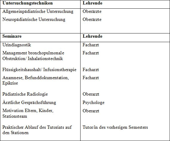 Im WS 2008/9 wurde ein neues Lehrmodell für das BP Kinderheilkunde eingeführt. Die Demonstration und praktische Übung von pädiatrischen Untersuchungstechniken (z. B. Racheninspektion, Otoskopie, Abdomen-Untersuchung) sowie die Lehre einzelner ärztlich konzipierter Unterrichtssmodule (z. B. Urindiagnostik, Infusionstherapie, Inhalationstherapie) wurden in den Aufgabenbereich von studentischen Tutoren überführt. Dafür wurden in der Universitäts-Kinderklinik Köln vor Beginn des WS 2008/9 acht Tutoren in einem einwöchigen Tutorentraining durch Assistenz- und Oberärzte der Klinik ausgebildet. Es handelte sich um Studierende, die das BP im vorhergehenden Semester erfolgreich absolviert hatten. Neben der theoretischen Ausbildung in der Kinderheilkunde und dem Training der Untersuchungstechniken wurden auch Lehrinhalte wie der Umgang mit Studierenden, Ärzten und Pflegepersonal und die Motivation von Patienten und ihren Eltern vermittelt (siehe Tabelle 1 [Tab. 1]). Die Konzeption dieses Trainings erfolgte durch die Erstautorin. Das einwöchige praktische und theoretische Tutorentraining erfolgte durch Oberärzte und erfahrene Fachärzte der Kinderklinik sowie durch die Erstautorin.