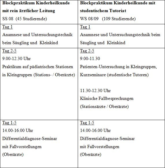 45 Studierende des 5. klinischen Semesters absolvierten in der zweiten Hälfte des Sommersemesters 2008 das konventionelle, einwöchige, rein ärztlich geleitete BP Kinderheilkunde auf den Stationen der Kinderklinik. Die Studierenden nahmen in Kleingruppen an der Stationsvisite und an Untersuchungen teil und erhielten je nach zeitlicher Verfügbarkeit der Stationsärzte und Oberärzte die Gelegenheit selbst unter ärztlicher Aufsicht Kinder zu untersuchen und mit den Ärzten Fallbesprechungen durchzuführen. Am Ende jeder BP-Woche erfolgten Feedback-Gespräche mit den Stationsärzten und den Studierenden über den aktuellen Verlauf des Praktikums und die erreichten Lernziele.
