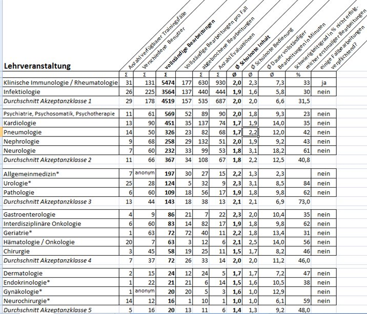 Tabelle 1: Nutzungsdaten der Trainingsfälle in verschiedenen Kursen sowie Ergebnisse eines kleinen Evaluationsfragebogens, der am Ende jeden Falles erscheint. Die Zahlen beziehen sich auf ein Durchschnittssemester, das aus dem Mittelwert von drei (bzw. bei „*“ aus zwei) Semestern im Zeitraum vom WS08/09 bis WS09/10 berechnet wurde. Die Kurse wurden nach der Anzahl vollständiger Fallbearbei¬tungen sortiert und in 5 Akzeptanzklassen eingeteilt: mehr als 1000 vollständige Bearbeitungen pro Semester, 200-1000 Bearbeitungen, 100-200 Bearbeitungen, 50-100 Bearbeitungen, weniger als 50 Bearbeitungen. Bei anonymen Kursen konnten keine erstmaligen Fallbearbeitungen und daher auch kein Schwierigkeitsgrad ermittelt werden. Der Kurs Klinische Immunologie/Rheumatologie wurde im SS09 und WS09/10 über die vhb auch Studierenden anderer bayerischer Universitäten zugänglich gemacht, pro Semester haben ca. 50 Studierende ca. 700 Fälle vollständig bearbeitet, wobei die weiteren Kenndaten ähnlich sind (die Noten sind bei „Inhalt“ etwas besser und bei Bedienung etwas schlechter als bei den Würzburger Studierenden und die Bearbeitungsdauer etwas länger). In weiteren Kursen wie medizinische Terminologie oder Klinische Chemie stehen nicht Trainingsfälle sondern unabhängige Fragen im Vordergrund, deswegen sind sie in Tab. 1 nicht berücksichtigt.