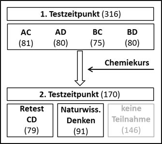 Methoden: 316 Studienanfänger nahmen an der Studie in der Orientierungseinheit im Jahr 2007 teil. Sie bearbeiteten verschiedene Versionen des HAM-Nat, die jeweils aus alten Fragen (HN2006) und neuen Fragen (HN2007) bestanden. Nach vier Wochen bekam die eine Hälfte der Studienanfänger erneut den HAM-Nat, allerdings nur die 2007er Version; die andere Hälfte bekam das Modul „Naturwissenschaftliches Denken“. Innerhalb dieser 4 Wochen konnten die Studienanfänger an einem fünftägigen Chemiekurs teilnehmen.