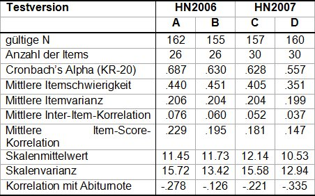 - Im neuen Test (HN2007) wurden signifikant weniger Items gelöst als im alten (HN2006) und die Wiederholung des gleichen Tests nach vier Wochen führte nicht zu besseren Testleistungen.