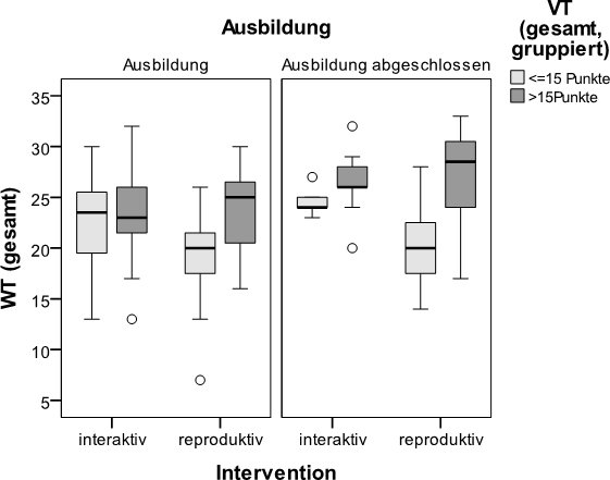 Abbildung 4: Die interaktive Intervention führte bei Probanden mit schlechteren Vortestergebnissen (hellgraue Boxen) zu signifikant besseren Leistungen im Nachtest als die reproduktive. Probanden mit abgeschlossener Berufsausbildung und Berufserfahrung schneiden in beiden Interventionsgruppen besser ab als die noch in Ausbildung befindlichen Probanden.