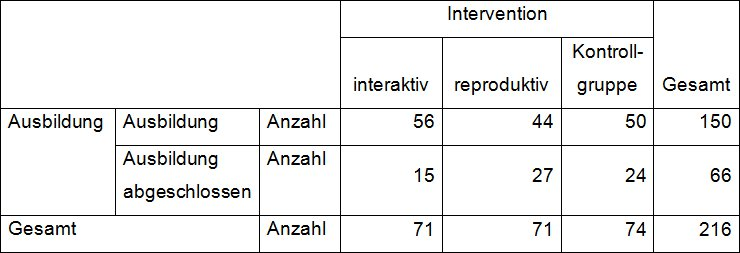 Es wird ein signifikanter Einfluss für die Interventionsgruppe (p=0.006) sowie die Ausbildungsgruppe (p=0.042) gefunden. Die Interventionsgruppen unterscheiden sich, wie bereits für die gesamten Daten gezeigt, signifikant von der Kontrollgruppe (p<0.0005).