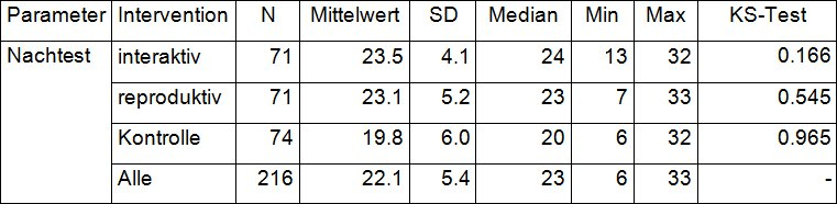 - Die Ergebnisse im Nachtest unterscheiden sich bei der interaktiven und reproduktiven Interventionsgruppe nicht.