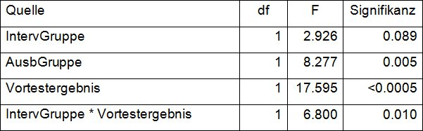 Im Rahmen dieser Analyse wurden die Probanden der Interventionsgruppen mit denen der Kontrollgruppe verglichen. Es wurde ein signifikanter Einfluss für die Intervention (ja/nein) (p<0.0005) gefunden. Im Mittel erreichten die Teilnehmer in den Interventionsgruppen 23.3 und in der Kontrollgruppe 19.8 Punkte im Nachtest, d.h. die Nullhypothese eines fehlenden Unterschiedes zwischen Interventions- und Kontrollgruppe kann abgelehnt werden.