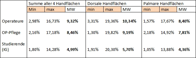 Als Referenzgruppe 1 diente erfahrenes OP-Pflegefachpersonal, da dieses bereits in der entsprechenden Fachausbildung die Durchführung der hygienischen und chirurgischen Händedesinfektion sowohl im theoretischen als auch fachpraktischen Unterricht erlernt.
