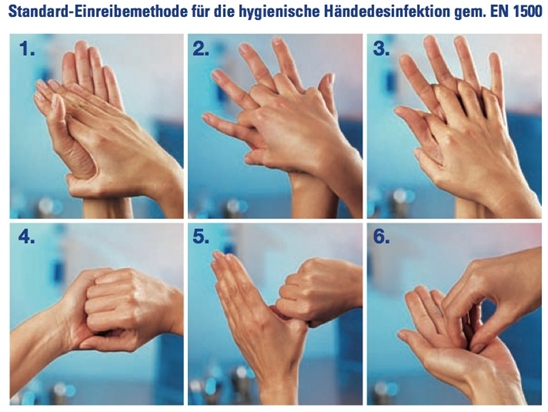 - Wie gut können Studierende in Abhängigkeit von ihren Vorkenntnissen mit einem einmaligen standardisierten Training die chirurgische Händedesinfektion nach EN1500 (siehe Abbildung 1 [Abb. 1]) erlernen? Reicht dieses Können für eine sichere Durchführung in der Praxis? Bringt die standardisierte Einreibemethode zusätzliche Effekte hinsichtlich einer suffizienten Händedesinfektion ohne Benetzungslücken?