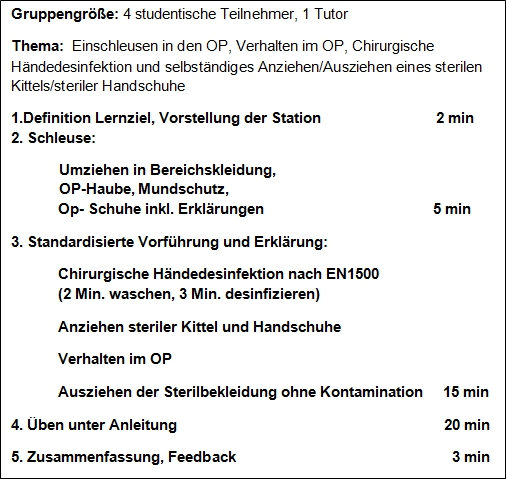 Das praktische Training (siehe Abbildung 3 [Abb. 3]) wurde im Peer-Teaching-Verfahren durchgeführt. Hierfür wird ein studentischer Tutor fachlich und medizindidaktisch zum Thema angelernt und führt die Trainingseinheiten in Kleingruppen von 4 studentischen Teilnehmern mehrfach täglich streng standardisiert durch. Das Training wurde nach studentischer und ärztlicher Befragung des dringendsten Schulungsbedarfes praktischer Kompetenzen an der Medizinischen Fakultät Dresden entwickelt und muss inzwischen vor Betreten eines OP des Universitätsklinikums Dresden nachgewiesen werden. Die Evaluationsergebnisse sind regelmäßig sehr gut (Durchschnittsnote 1,24 bei Schulnotenskala 1=sehr gut bis 5=mangelhaft) und die Teilnehmer geben einen großen Zuwachs praktischer Kompetenz und Sicherheit an. Die Gesamtkosten beliefen sich auf rund 10 EUR pro Teilnehmer.