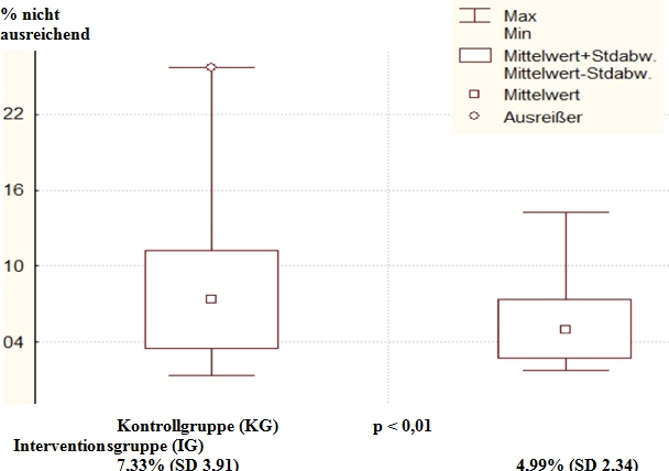 Mittels einmaligem Training zeigte die Interventionsgruppe hochsignifikant geringere Benetzungslücken im Vergleich zur Kontrollgruppe. Darüber hinaus wurde auch die Streubreite reduziert.