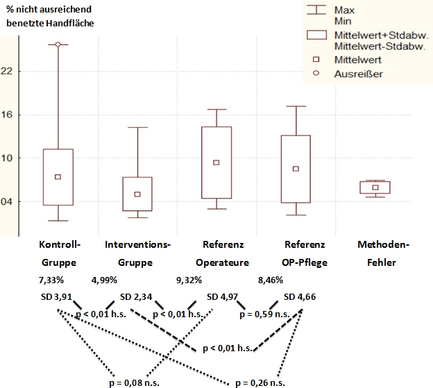 Die recht einfache praktische Fertigkeit der chirurgischen Händedesinfektion mit dem Ziel der vollständigen und gleichmäßigen Benetzung sollte allenfalls vereinzelte und sehr kleine Benetzungslücken aufzeigen. Alle Teilnehmer wussten um die Überprüfung des Desinfektionsergebnisses, sodass die Motivation nach dem bestmöglichen Ergebnis in allen – auch den Referenzgruppen – zu erkennen war.