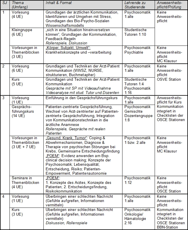 Im 1. Masterstudienjahr erlernen die Studierenden in einer Vorlesung und einem Kurs das Überbringen einer schlechten Nachricht. Die Gruppen von circa zwölf Studierenden werden dabei von jeweils einem Vertreter der Psychosomatik und einem Vertreter der Onkologie/Hämatologie betreut. Im Kurs haben die Studierenden die Gelegenheit, mit Experten zu diskutieren und in Rollenspielen das Überbringen einer schlechten Nachricht zu üben.