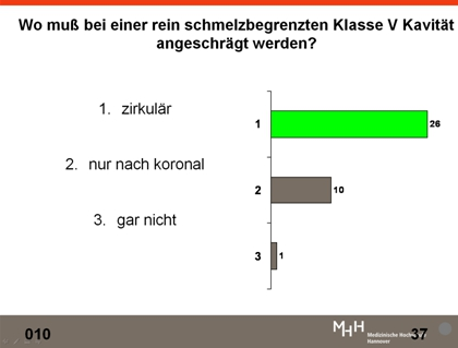 Nach Genehmigung des Studienvorhabens durch die Ethikkommission der Medizinischen Hochschule Hannover (Studien-Nr.: 1006-2011) wurden die Studierenden (n=74) des 1. klinischen Semesters im Sommersemester 2011 randomisiert einer Studien- und einer Kontrollgruppe zugeordnet. Die Randomisierung erfolgte durch das Institut für Biometrie der Medizinischen Hochschule Hannover unter Berücksichtigung der Faktoren Alter, Geschlecht und Note im Physikum. Die Vorlesungen der Studien- und Kontrollgruppe waren in Bezug auf den Inhalt des Vortrags gleich aufgebaut mit identischen Präsentationsfolien. Beide Gruppen erhielten im Studienfach Zahnerhaltung die jeweiligen Vorlesungsinhalte in den verschiedenen Teildisziplinen (Kariologie, Parodontologie, Endodontologie, Kinderzahnheilkunde) von demselben (Fach)-Dozenten. Im Verlauf der Vorlesung wurden jeweils fünf MC-Fragen (siehe Abbildung 1 [Abb. 1]) zu den formulierten Lernzielen gestellt und unter Anwendung eines ARS von den Studierenden beantwortet. Die empfohlene Anzahl für Fragen innerhalb einer 50-minütigen Vorlesung liegt zwischen zwei bis vier [3] und zwei bis fünf [2]. Für die Qualitätssicherung wurden alle MC-Fragen einem prä- und post-Review-Prozess unterzogen [26]. Mitarbeiter der Abteilung führten eine Prüfung auf Verständlichkeit, Logik und Lösungshinweise durch. Parallel zur Vorlesung wurde fünfmal pro Woche am Nachmittag der praktische Phantomkursus der Zahnerhaltung abgehalten, in dem die Studierenden sich die nötigen praktischen Fähigkeiten für das Fach der Zahnerhaltung aneignen sollen (siehe Tabelle 1 [Tab. 1]).