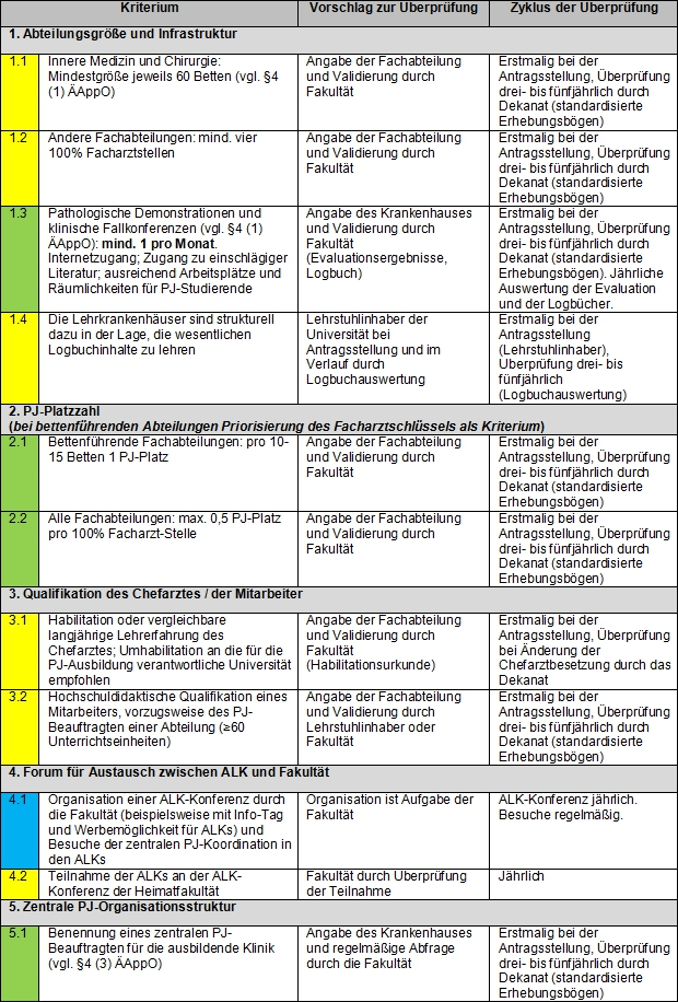 Tabelle 1: Definition und Vorschlag zum Überprüfungsmodus der Kriterien zur Strukturqualität (grün = Kriterium anzuwenden auf ALK und Universitätskliniken; gelb = Kriterium anzuwenden auf ALK; blau = Kriterium anzuwenden auf Universitätskliniken/Medizinische Fakultät)