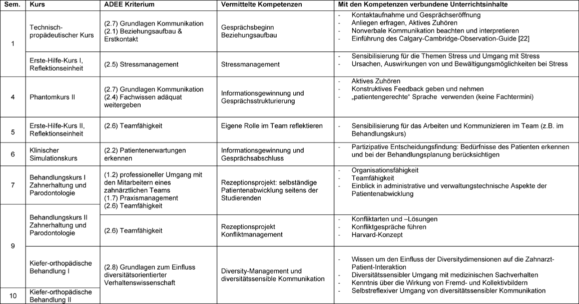 Im Jahr 2009 entstand im Rahmen des Sonderprogramms „Innovation und Lehre“ (gefördert bis 2011 durch Mittel aus Studienbeiträgen) der Universität zu Köln das Projekt „Longitudinalcurriculum soziale und kommunikative Kompetenz für Zahnmediziner“ (LSK-Dent). Ziel war die Entwicklung und Implementierung eines evidenzbasierten Curriculums zur Zahnarzt-Patienten-Kommunikation. Ausgehend von den oben beschriebenen ADEE-Kriterien wurden neue Kurse entwickelt und implementiert (siehe Tabelle 1 [Tab. 1]). Ziel hierbei war es, Verknüpfungen zwischen bereits bestehenden Lehrangeboten und neuen Lehrinhalten zu etablieren, sodass die neuen Unterrichtseinheiten in die bereits vorhandenen Kurse eingebunden werden konnten und keine zeitliche Mehrbelastung für die Studierenden entstand.