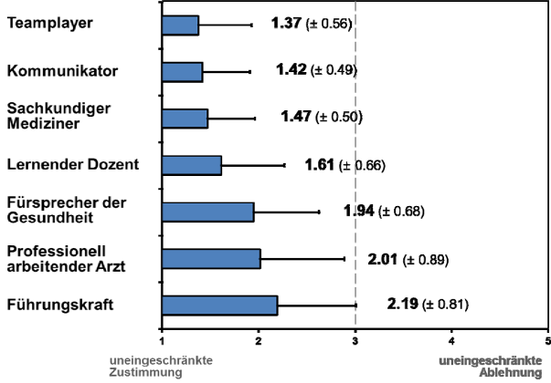 Die Einzelbewertungen der Rollen-definierenden Kompetenzen finden sich in Abbildung 1 [Abb. 1]. Sie sind aufgeteilt in: