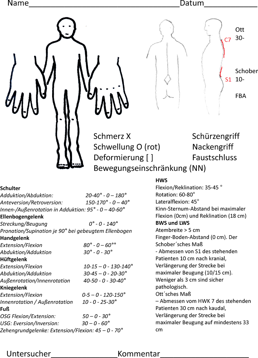 Die Erhebung der Anamnese wird im 2. Semester durch Allgemeinmediziner vermittelt. Patienten der regionalen Morbus Bechterew Selbsthilfegruppe stehen dabei als Übungspersonen zur praktischen Anwendung den Studierenden zur Verfügung. Anschließend können die angehenden Mediziner in einem ersten Hausarztpraktikum die Anamnese und Untersuchung des Bewegungsapparates anwenden. Eine standardisierte Dokumentation wurde dafür entwickelt (siehe Abbildung 2 [Abb. 2]). Die beteiligten Hausärzte haben an einem Training zu den Untersuchungstechniken durch studentische Tutoren teilgenommen.