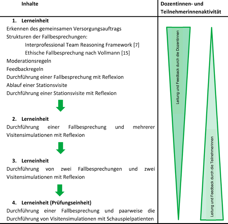 Das Pilotprojekt ist als Seminar konzipiert und umfasst vier Lerneinheiten mit je vier Unterrichtsstunden. Für eine Übersicht ist in Abbildung 1 [Abb. 1] der Ablauf des Seminars dargestellt. Zu Beginn der ersten Lerneinheit werden die gemeinsamen und unterschiedlichen Aufgaben der beiden Professionen in der Patientenversorgung erfasst. Dies dient dem Einblick in die beruflichen Aufgaben der anderen Profession. Zusammenfassend wird das gemeinsame Ziel der Patientenversorgung hervorgehoben. Der Austausch über die beruflichen Aufgaben und ein gemeinsames Ziel sind wichtige Bestandteil der Kontakthypothese [11]. Im Folgenden werden die Lernenden in zwei Strukturen für Fallbesprechungen eingeführt: das Interprofessional Team Reasoning Framework [7] und die Fallbesprechung nach Vollmann [21]. Im Anschluss erfolgt die Einführung in Moderations- und Feedbackregeln. Die erste Fallbesprechung wird durch eine Dozentin moderiert, die Lernenden übernehmen die Rollen in den Fallbesprechungen. Anschließend werden die Durchführung und das Ergebnis der Fallbesprechung reflektiert sowie Alternativen diskutiert. Als nächstes wird der Ablauf einer gemeinsamen Stationsvisite dargestellt. Die Dozentinnen demonstrieren die Vermittlung des Ergebnisses aus der Fallbesprechung an den Patienten im Rahmen einer Stationsvisite. Dabei übernimmt ein Lernender die Patientenrolle. Anschließend erfolgt eine angeleitete Reflexion durch die Dozentinnen. Strukturiertes Feedback im Anschluss an die Simulationen ergänzt diesen Lernprozess [24].