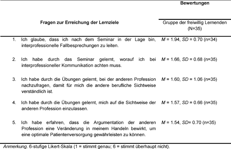 In den Seminaren wurde den Lernenden die Möglichkeit geboten, durch Fallbesprechungen eine strukturierte Kommunikation und das Überbringen des Ergebnisses in Visitensimulationen zu üben. Durch die geringe Teilnahme der Medizinstudierenden in den ersten Gruppen und die Änderung von regulärem Unterricht zu freiwilliger Teilnahme der Gesundheits- und Krankenpflegeschülerinnen, konnte der geplante Vergleich der Gruppen nicht durchgeführt werden. Wie zuvor berichtet, wurden nur die Daten von Personen genutzt, die freiwillig an diesem Seminar teilnahmen. Die Ergebnisse beziehen sich auf Gesundheits- und Krankenpflegerinnen aus den Gruppen 5-8 und Medizinstudierende aus den Gruppen 1, 2, 4-8. Die geringe Teilnehmerzahl begrenzte die statistische Auswertbarkeit. Es werden daher ausschließlich deskriptive Daten berichtet, die wertvolle Hinweise für eine Verstetigung und Implementierung in die medizinischen und pflegerischen Curricula bieten. Die Datenauswertung erfolgte mit dem Statistikprogramm SPSS (Version 22).