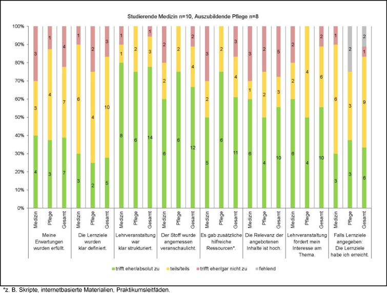 Zum Wintersemester 2014/2015 hatten sich insgesamt 10 Medizinstudierende (n=4 Semester 5, n=5 Semester 7, n=1 fehlende Angabe) und 9 von 24 Pflegeauszubildenden des adressierten fünften Semesters für die Lehreinheit angemeldet. Ein Pflegeauszubildender musste krankheitsbedingt seine Anmeldung zurückziehen, sodass insgesamt 10 Medizinstudierende und 8 Pflegeauszubildende (5 GKP- und 3 GKKP-Auszubildende) teilnahmen. Diese beteiligten sich vollzählig an der Befragung zu beiden Messzeitpunkten.