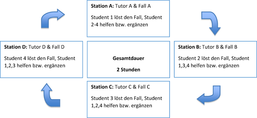 Jede Kleingruppe besteht aus vier Studierenden (Student [1], [2], [3], [4]) die zusammen vier Stationen (Station A, B, C, D) durchlaufen. In jeder Station übernimmt einer der Teilnehmer die Rolle des Arztes/der Ärztin und bearbeitet den Fall. Die anderen Teilnehmer der Kleingruppe beobachten die Situation, geben gegebenenfalls Hilfestellung und ein abschließendes Feedback. Am Ende soll jeder Teilnehmer einen Fall absolviert und bei drei anderen Fällen als Zuschauer Hilfestellung und Feedback gegeben haben (siehe Abbildung 1 [Abb. 1]). Der Tutor der jeweiligen Station hat die Aufgabe, das Fallbeispiel vorzulesen, eine Checkliste abzuhaken, die anschließend besprochen wird (siehe Anhang 1 [Anh. 1]), Hilfestellung zu geben und am Ende der Übung den Teilnehmern ein konstruktives Feedback zu geben. Die Stationen decken verschiedene Fachgebiete ab, so gibt es jeweils eine Station mit einem Fall aus der Neurologie, Chirurgie/Orthopädie und Inneren Medizin. Bei den verschiedenen Fällen bleiben grundlegende Komponenten des Untersuchungsvorgangs gleich. Am Anfang jeder Untersuchung steht die Händedesinfektion und Begrüßung des Patienten, gefolgt von einer Anamnese.