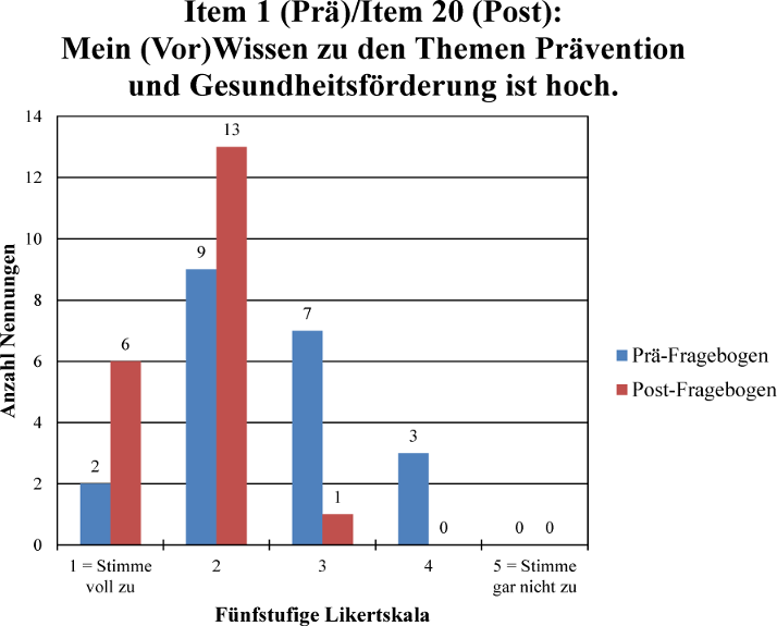 Laut Prä-Fragebogen ist das Vorwissen (Item 1) der Teilnehmer zu den Themen Prävention und Gesundheitsförderung bereits vor Seminarbeginn hoch (Median=2,0; Range=3,0). Bei der Post-Befragung (Item 20) verschiebt sich der Median-Wert nicht, die Range wird kleiner (Median=2,0; Range=2,0) (siehe Abbildung 1 [Abb. 1]).