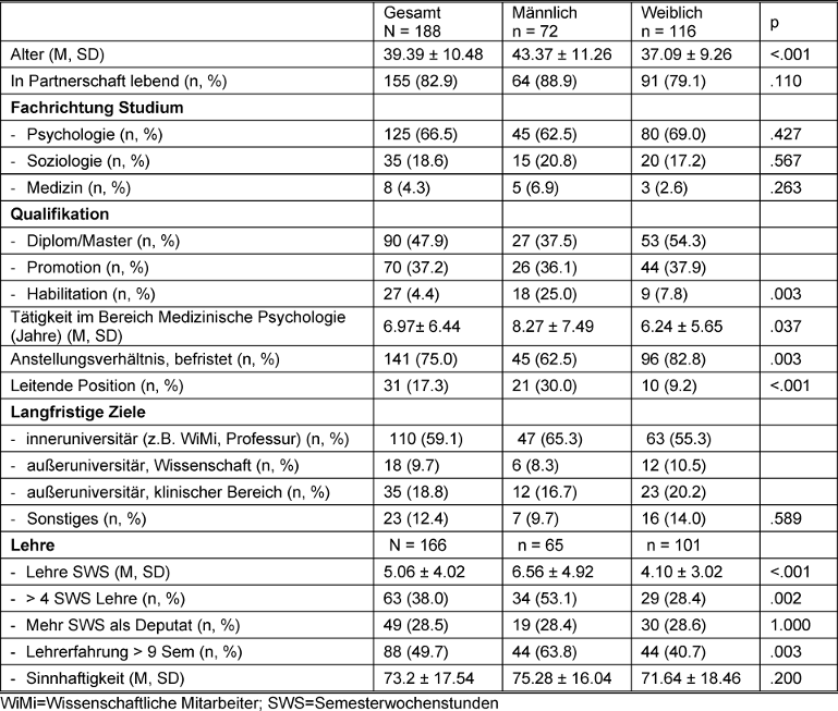 Insgesamt 188 Teilnehmer (62% Frauen) beantworteten den Online-Fragebogen. Der Rücklauf lag somit bei 39.2%. Die Teilnehmer waren im Mittel 39.39 Jahre alt (SD=10.48), die Männer waren durchschnittlich 6 Jahre älter als die Frauen (siehe Tabelle 1 [Tab. 1]). Die überwiegende Mehrheit der Befragten (66.5%) hatte ein Psychologie-Studium, 18.6% ein Soziologie-Studium und 4.3% ein Studium der Humanmedizin absolviert. Während es bei der Fachrichtung keine Geschlechterunterschiede gab, unterschieden sich Männer und Frauen hinsichtlich ihres akademischen Grads: Mehr Frauen (54.3%) als Männer (37.5%) gaben als akademischen Grad Bachelor oder Diplom/Master an, während 15% der Männer vs. 7,8% der Frauen habilitiert waren (p = .003). Im Mittel waren die Befragten 7 Jahre in der Medizinischen Psychologie tätig, 75% der Befragten in einer befristeten Position (Männer 62.5%, Frauen 82.8%, p=.003). Sowohl der Geschlechterunterschied in Bezug auf den akademischen Grad als auch der höhere Anteil von Männern bei entfristeten Stellen entsprachen einem höheren Anteil von Männern in einer leitenden Position (30% vs. 9.2% Frauen, p<001).