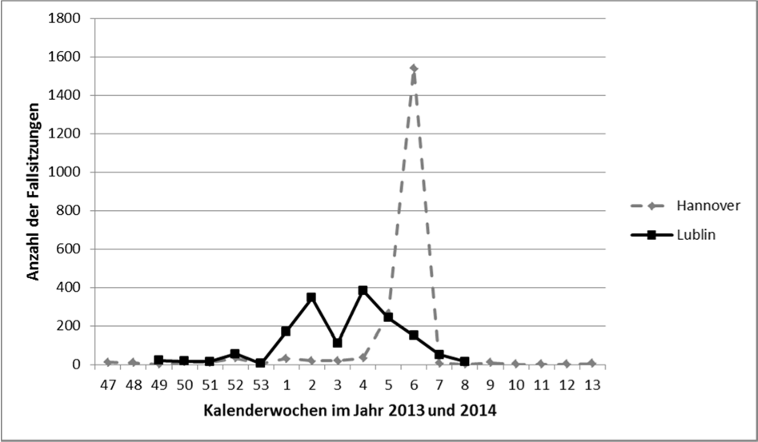 Die Nutzung der VPs mit Anzahl der Fallsitzungen pro Woche in Hannover und Lublin wird in Abbildung 3 [Abb. 3] dargestellt. In Hannover ist der Zeitpunkt der höchsten Auslastung mit 1540 Fallsitzungen in der sechsten Woche des Jahres 2014. In Lublin fand die höchste Auslastung mit 383 Sitzungen bereits in der vierten Woche des Jahres 2014 statt.