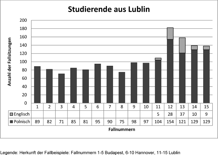 Die Fallnutzung von Studierenden aus Lublin zeigt ähnliche Ergebnisse. Im Allgemeinen wurden mehr Fallbeispiele, welche in Lublin erstellt wurden, bearbeitet. Bei einem Angebot eines Fallbeispiels in englischer und polnischer Version, wurden mehr Sitzungen in Polnisch durchgeführt.