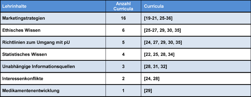 Wie in Tabelle 2 [Tab. 2] ersichtlich, behandeln viele Curricula unterschiedliche Marketing-Instrumente von pU (16/20 Curricula), deren Einfluss auf die klinische Entscheidungsfindung (15/20 Curricula) und Möglichkeiten des Umgangs mit diesen Strategien (16/20 Curricula). Hierbei wird in den meisten Curricula insbesondere auf die Interaktion mit Pharmavertretern (PV) eingegangen. Drei der 16 Curricula, die Marketing-Strategien behandeln, lehren zusätzlich, welche unabhängigen Informationsquellen es gibt [28], [31], [32]. In den anderen Publikationen wird nicht genannt, welche Möglichkeiten des Umgangs mit Marketing behandelt werden; nur in einer Publikation wird erwähnt, dass auch rechtliche Grenzen von Interaktionen mit PV thematisiert wurden [29].