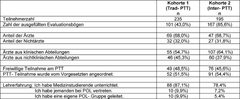 Das Trad- PTT absolvierten 235 Tutoren (Kohorte 1), von denen 43% den Evaluationsbogen ausfüllten. Das Inter- PTT beendeten 195 Tutoren (Kohorte 2), von denen 85,6% das Training evaluierten (siehe Tabelle 3 [Tab. 3]). Beim Vergleich des professionellen Hintergrunds kamen 68,0% der Kohorte 1 aus der Medizin inkl. Zahn- und Tiermedizin, 32,0% aus Natur- oder Geisteswissenschaften. Die ärztlichen Tutoren kamen zu 54,7% aus klinischen Disziplinen, zu 45,3% aus der Vorklinik oder Forschung. In Kohorte 2 waren die Werte vergleichbar. In Kohorte 1 hatten 87,1% bereits Lehrerfahrung (mehr als eine Antwort möglich), in Kohorte 2 gaben 78,4% Lehrerfahrung an. Zur Teilnahmemotivation wurde die Teilnahme auf eigenen Wunsch, auf Empfehlung von Kollegen oder nach Abordnung durch Vorgesetzte differenziert (mehr als eine Antwort möglich). Alle, die „Abordnung durch Vorgesetzte“ angekreuzt hatten, wurden als „Unfreiwillige“ zusammengefasst. In beiden Kohorten nahm rund die Hälfte der Tutoren unfreiwillig am PTT teil.