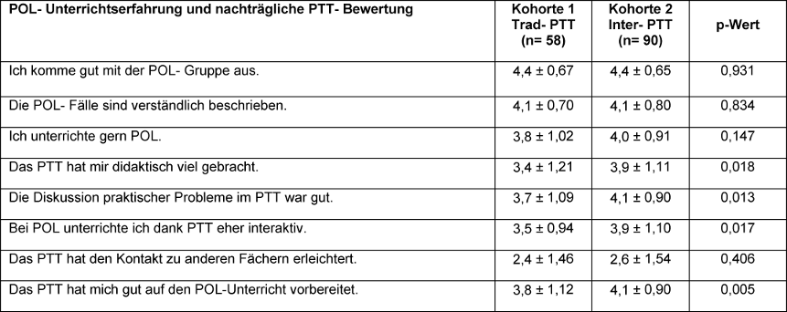 Die Fragebögen wurden getrennt nach Trad- PTT und Inter- PTT ausgewertet (siehe Tabelle 5 [Tab. 5]). Die Unterschiede zwischen beiden Kohorten waren in Bezug auf die PBL- Motivation gering: Alle Befragten kamen mit diesem Lehrformat gut zurecht und unterrichteten es gern. Bei der Bewertung des absolvierten PTT schnitt das Inter- PTT in allen Kategorien signifikant besser ab: Die Absolventen berichteten, sie hätten vom PTT didaktisch profitiert, und das Training habe sie gut auf den PBL- Unterricht vorbereitet. Zur Frage der Interdisziplinarität (“Das PTT hat den Kontakt zu anderen Fächern erleichtert”) gab es keine Unterschiede zwischen den PPT- Konzepten.