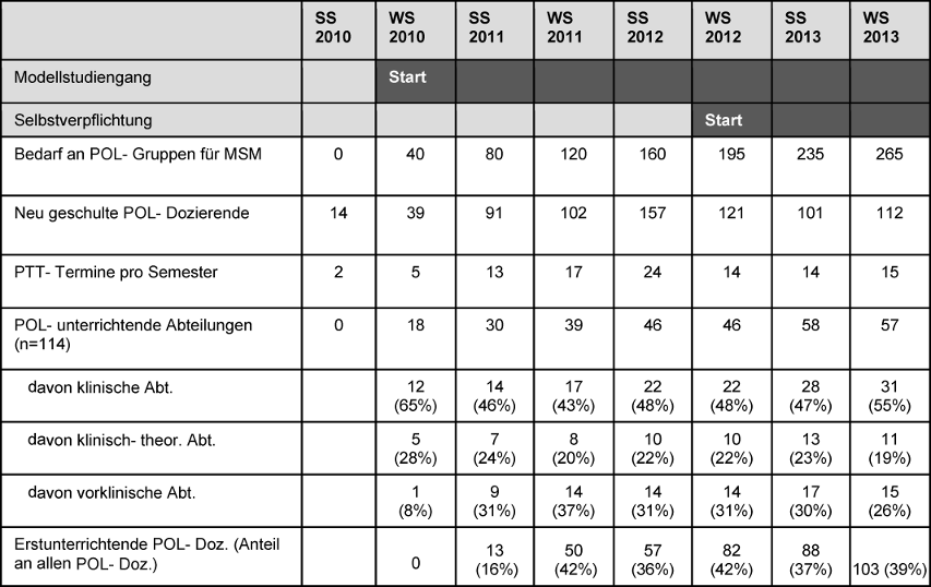 Durch die Einführung des Modellstudiengangs stieg die Zahl der PTTs (siehe Tabelle 6 [Tab. 6]). Die Einführung der Selbstverpflichtung führte dazu, dass der PTT- Bedarf zurückging und trotzdem über 100 neue PBL Tutoren pro Semester zur Verfügung standen. Die Zahl der PBL- unterrichtenden Abteilungen blieb konstant bei knapp 60 von 114 Abteilungen, rund die Hälfte waren klinische Abteilungen. Die Zahl der erstmalig PBL Unterrichtenden (im Verhältnis zu allen PBL Tutoren) blieb seit der Einführung der Selbstverpflichtung konstant. Die Abfrage der Selbstverpflichtung 2013 ergab, dass nur einzelne Abteilungen ihrer Verpflichtung nicht nachkamen, weil geschulte PBL Tutoren wegen Vertragsende, Rotation oder Elternzeit nicht mehr verfügbar waren.