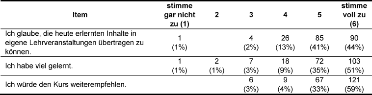 Über einen möglichst hohen Lernzuwachs hinaus sollen die vermittelten Inhalte für die Teilnehmerinnen und Teilnehmer auch eine hohe Praxisrelevanz haben, sodass sie leicht in den jeweiligen Lehralltag integriert werden können. Ein wichtiger Indikator für die Bewertung der Güte eines Angebots ist weiterhin die Frage nach der Weiterempfehlung. Diese drei Aspekte – subjektiver Lernerfolg, Praxisrelevanz und Weiterempfehlung – wurden deshalb exemplarisch aus der Vielzahl der in dem Evaluationsbogen abgefragten Items ausgewählt und sind in der nachfolgenden Tabelle 2 [Tab. 2] dargestellt. Die beiden jeweils besten Bewertungsmöglichkeiten haben bei allen drei Items einen Anteil von 85% oder mehr und sehr unzufrieden ist nur eine verschwindend geringe Minderheit.