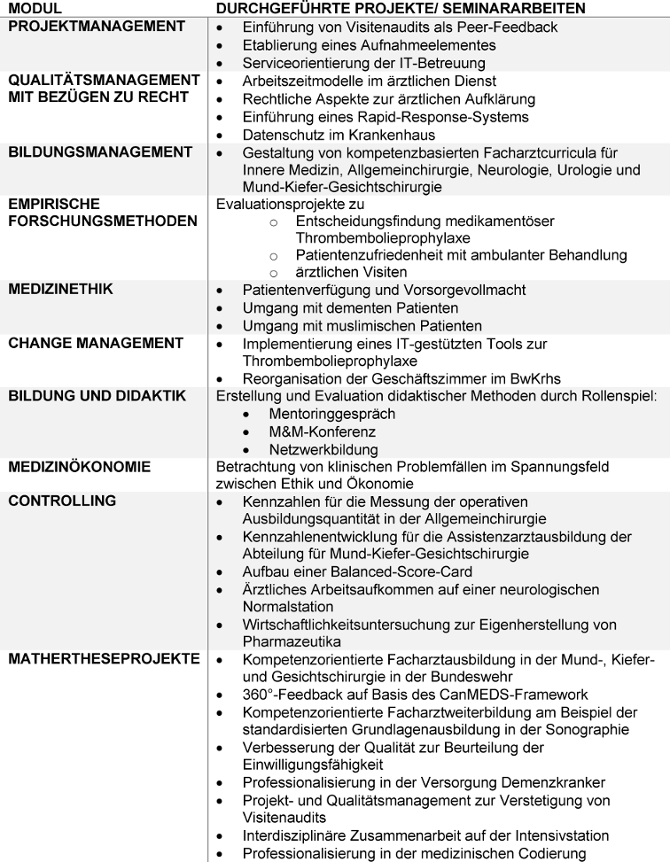 Seit Herbst 2013 wurden 9 Studienmodule durchgeführt und darin mehr als 30 Projekte, die sich zu großen Teilen den organisatorischen Rahmenbedingen oder konkret der Aus- und Weiterbildung widmen, realisiert (siehe Tabelle 1 [Tab. 1]). Die darauf weiter aufbauenden Masterarbeiten befinden sich aktuell in der Bewertung.