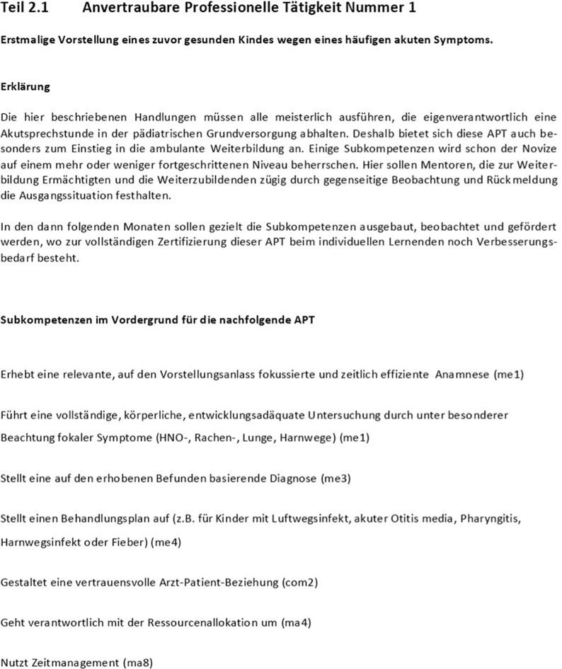 Literaturrecherche und eigene Forschungen haben ergeben, dass das Konzept der anvertraubaren professionellen Tätigkeiten des niederländischen Bildungswissenschaftlers Olle ten Cate mit konsentierten Kerninhalten der Pädiatrie ein zukunftsweisendes Modell ergeben kann.