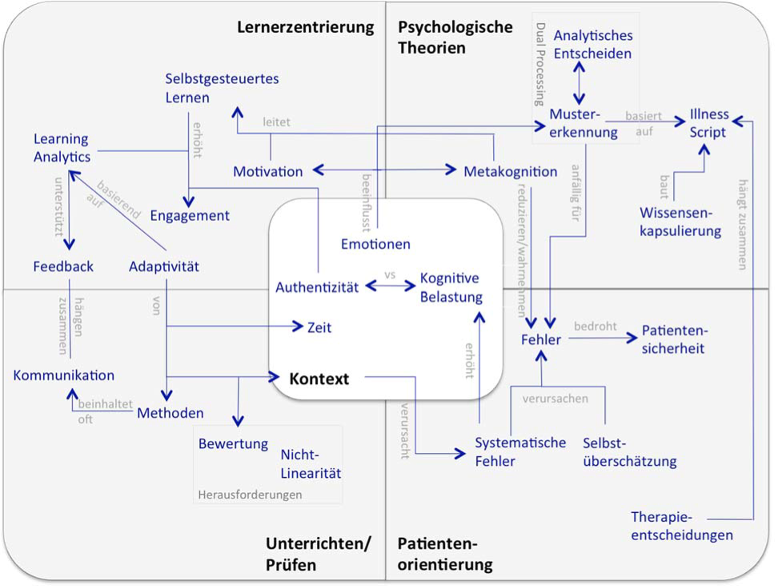 Der Kontext bildete sich als Kategorie aus, die die meisten Aspekte des Erlernens von klinischem Entscheiden beeinflusst [18]. Ein Patient und ein Mitarbeiter aus dem Gesundheitswesen (z.B. eine Ärztin) interagieren in einer bestimmten Umgebung oder einem Kontext miteinander, wobei Emotionen diese Interaktionen beeinflussen und eine wichtige Rolle im klinischen Entscheidungsprozess darstellen [19]. Ebenfalls relevant ist in diesem Zusammenhang der Lernkontext - wo, mit wem und wie das Lernen stattfindet [20]. In einer Lernumgebung beeinflusst ein Gleichgewicht aus Realitätsnähe und kognitiver Beanspruchung die Lernerfahrung [21], [22].