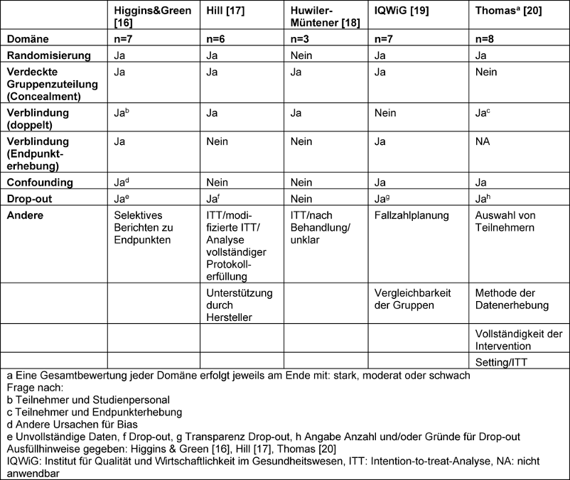Auf der Basis eines Health Technology Assessment Berichts wurde der Fokus auf generische Instrumente publiziert nach dem Jahr 2000 zur Komponentenbewertung der Qualität von Evidenz gerichtet [15]. Mit einem Instrument zur Komponentenbewertung werden alle Aspekte, die zu Bias führen können, wie z.B. Randomisierung oder Art der Verblindung erfasst. Fünf Instrumente wurden eingesetzt [16], [17], [18], [19], [20], die sich in der Anzahl von Domänen, Fragen innerhalb von Domänen und Antwortmöglichkeiten unterschieden (siehe Tabelle 1 [Tab. 1]).