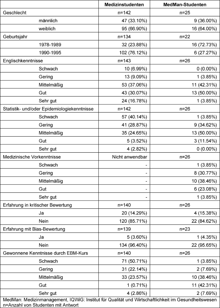 Insgesamt nahmen 167 Studenten an den EBM-Kursen teil, von denen 142 Medizinstudenten im dritten Studienjahr und 25 Studenten des Masterprogramms Medizinmanagement waren (siehe Tabelle 3 [Tab. 3]).
