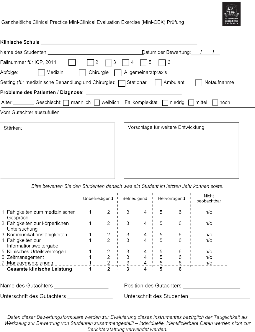 Am Ende des letzten Semesters des MBBS (Bachelor of Medicine, Bachelor of Surgery) Studiengangs an einer großen australischen medizinischen Schule wurden alle Mini-CEX Bewertungsformulare von drei der insgesamt fünf städtischen medizinischen Schulen gesammelt (das für den Unterreicht verwendete Formular ist in Abbildung 1 [Abb. 1] dargestellt).