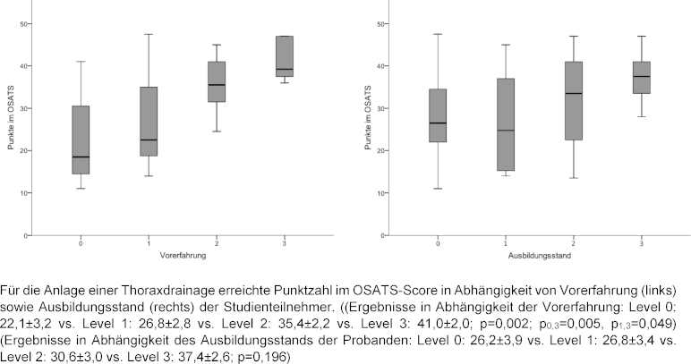 Material und Methodik: In die vorliegende Pilotstudie wurden 41 Probanden eingeschlossen (Medizinstudierende (3.-6. Studienjahr) n=9, Assistenzärzte (1.-3. Ausbildungsjahr) n=12, Assistenzärzte (4.-6. Ausbildungsjahr) n=14, Fachärzte n=6. Die Stratifizierung der Probanden erfolgte nach formalem Ausbildungsstand sowie nach individueller Vorerfahrung im Bereich der Thoraxdrainagenanlage in jeweils 4 Gruppen (Level 0-3). Die Thoraxdrainagenanlage erfolgte an Schweinekadavern unter standardisierten Bedingungen. Die Bewertung der Trainingsperformance erfolgte mittels Videoaufzeichnungen des Eingriffs (Videorating) durch zwei unabhängige Rater anhand des modifiziertem OSATS zur Thoraxdrainagenanlage.