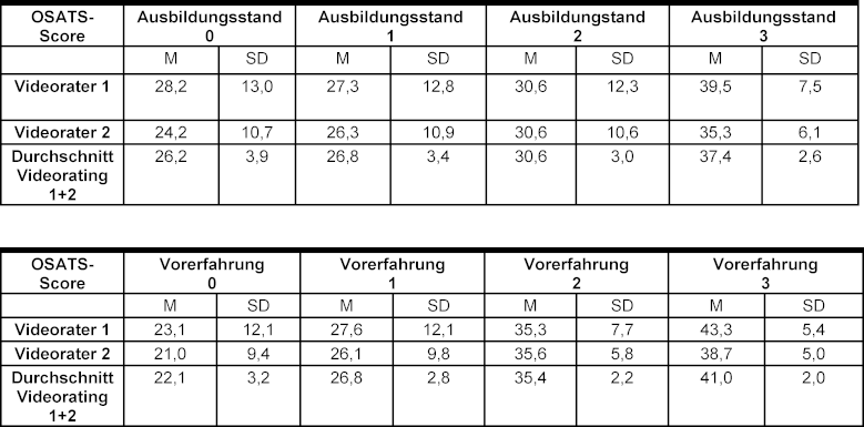 Ergebnisse: Bei Stratifizierung nach Vorerfahrung der Probanden zeigten sich signifikante Unterschiede zwischen den Leistungen der vier Gruppen (Level 0: 22,1±3,2 vs. Level 1: 26,8±2,8 vs. Level 2: 35,4±2,2 vs. Level 3: 41.0±2,0; p=0.002; p0,3=0.005, p1,3=0.049,). Bei Stratifizierung nach formalem Ausbildungsstand zeigten sich hingegen keine signifikanten Unterschiede.