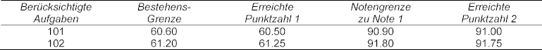Hat er etwa mit 60,50 erreichten Punkten die rechnerische Bestehensgrenze 60,60 knapp verfehlt, führt die Berücksichtigung der eliminierten Aufgaben dazu, dass er mit 61,25 Punkten oberhalb der Bestehensgrenze von 61,20 Punkten für 102 Aufgaben liegt (siehe Tabelle 1 [Tab. 1], Spalte „Bestehensgrenze“ und „Erreichte Punktzahl 1“).