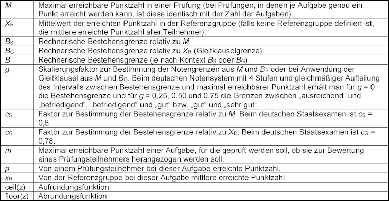 Absolute und relative Bestehensgrenzen („Gleitklausel“) sind in den meisten Studien- oder Prüfungsordnungen vorgegeben. Bezeichnet M die maximal zu erreichende Punktzahl (man beachte, dass bei Prüfungen, wie etwa den Staatsexamina, in denen je Aufgabe genau ein Punkt erreichbar ist, M mit der Zahl der Aufgaben übereinstimmt), XR das Mittel der bei der Prüfung erreichten Punktzahl (bei Definition einer Referenzgruppe ist deren Mittel zu verwenden), so sind die absolute Bestehensgrenze BS und die relative Bestehensgrenze BG entsprechend der Gleitklausel mittels zweier Konstanten cS bzw. cG festgelegt: