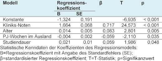 In der Mann-Whitney-U-Statistik zeigte sich ein signifikanter Unterschied der schriftlichen Noten des 2. ÄP zwischen Teilnehmern unserer Studie, die ihr PJ im Ausland verbrachten, und denen, die es nicht taten (U=29.254, p<0,001, Cohen’s d=0,406). Diejenigen, die ein Auslands-PJ absolviert hatten, hatten im Mittel die Note 2,8±0,8 erreicht, während die übrigen die Note 3,1±0,7 erreichten. Auch nach Stratifizierung der Studienkohorte entsprechend der Note im 1. ÄP zeigten sich bessere Leistungen im 2. ÄP bei den Teilnehmern mit Auslandsabschnitten im PJ (siehe Tabelle 2 [Tab. 2]). Daher berechneten wir eine multiple Regression mit den schriftlichen Noten des 2. ÄP als abhängige Variable und die Variablen Alter, Studiendauer, Kliniks-Noten sowie Anzahl der im Ausland geleisteten PJ-Wochen als Prädiktoren. Das Merkmal Geschlecht erreichte die vorab festgelegte Signifikanzschwelle von 0,05 nicht und wurde daher nicht in das Modell aufgenommen. Es zeigte sich ein korrigiertes R² von 0,59 (F(4, 537)=195,957; p<0,001), entsprechend einer hohen Effektstärke (Cohen’s f²=1,44). Die Durbin-Watson-Statistik mit einem Wert von 1,87 sprach für unabhängige Fehlerwerte, also keiner Autokorrelation. Die Kollinearitätsstatistik der Prädiktoren zeigte Toleranzwerte zwischen 0,85 und 0,972 bzw. VIF-Werte zwischen 1,029 und 1,177, womit eine Multikollinearität ausgeschlossen werden konnte. Tabelle 3 [Tab. 3] stellt die Koeffizienten ausführlich dar. Den stärksten Einfluss übten dabei die Kliniks-Noten mit einem standardisierten Regressionskoeffizienten von 0,717 aus. Alter, PJ-Wochen im Ausland und Studiendauer spielten eine untergeordnete Rolle. Während in diesem Modell ein höheres Alter bzw. eine längere Studiendauer einen ungünstigen Einfluss auf die Prüfungsnote des 2. ÄP aufzeigte, deutete das Ableisten von PJ-Abschnitten im Ausland auf bessere Noten. Mit der folgenden Gleichung wurde ein Vorhersagewert y für die schriftliche Note des 2. ÄP errechnet: y=-1,324+1,664xKliniks-Noten+0,014xAlter–0,004xAuslands-PJ-Wochen+0,021xStudiendauer. Im Wilcoxon-Vorzeichenrangtest zeigte sich kein Unterschied zwischen dem Vorhersagewert und der tatsächlich erreichten schriftlichen Note im 2. ÄP, weder für die Gesamtkohorte noch für die einzelnen Subgruppen gebildet anhand der Anzahl der im PJ im Ausland verbrachten Zeit.