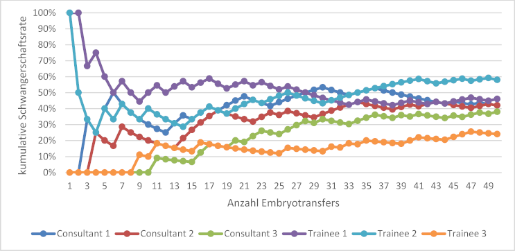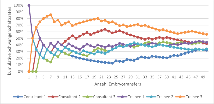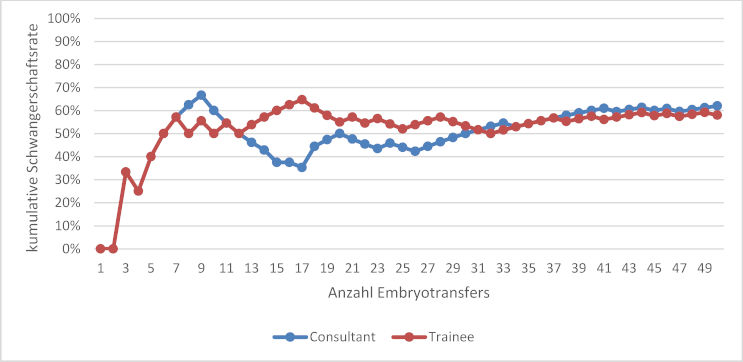 Abbildung 1: Lernkurve der kumulativen Schwangerschaftsrate für die ersten 50 Embryotransfers, die von einem erfahrenen Kliniker (Konsiliararzt) und einem Arzt in der Ausbildung (Fellow) während der Studiendauer durchgeführt wurden