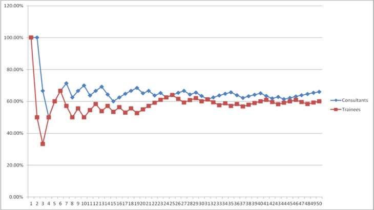 Die Daten wurden weiter analysiert hinsichtlich der Kontrolle von Variablen, von denen angenommen wird, dass sie einen Einfluss auf das Ergebnis des Zyklus haben (siehe Tabelle 3 [Tab. 3] und Tabelle 4 [Tab. 4]), einschließlich: Alter (≤37 Jahre), Art des Katheters (weich) und Embryonenqualität (ausgedehnte Blastozysten von Grad ≥2), jeweils für die ersten und letzten 50 ETs, die von erfahrenen Konsiliarärzten und Ärzten in der Ausbildung durchgeführt werden. Die Gesamtschwangerschaftsrate für erfahrene Kliniksärzte, untersucht nach Störvariablen, betrug 65,7% bzw. 40,9% für die ersten bzw. letzten 50 ETs. Die Gesamtschwangerschaftsrate betrug 66,7% bzw. 53,6% für die Ärzte in der Ausbildung. Bei den Lernkurven zeigen sich keine signifikanten Unterschiede bei den beiden großen Gruppen praktizierender Kliniksärzte (siehe Abbildung 3 [Abb. 3] und Abbildung 4 [Abb. 4]): p=0,95 für die ersten 50 Transferverfahren und p=0,37 für die letzten 50 Transferverfahren.
