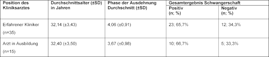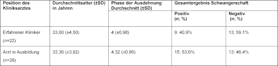 Eine weitergehende Analyse der Daten unter Stratifizierung der Störvariablen Alter, Qualität des Embryos und Art des verwendeten Katheters, die bekanntermaßen Auswirkungen auf das Ergebnis von ART-Zyklen haben, zeigte keine signifikanten Unterschiede bei den Schwangerschaftsraten zwischen ET-Verfahren, die von einem erfahrenen Kliniker bzw. einem Arzt in der Ausbildung durchgeführt worden waren.
