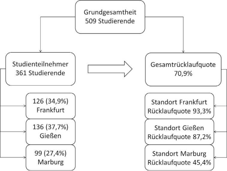 Insgesamt konnten 361 Fragebögen in die Auswertung einbezogen werden, was einer Rücklaufquote von 70,9% entspricht. Die Rücklaufquoten variieren dabei im Standortvergleich stark (siehe Abbildung 1 [Abb. 1]). Die soziodemographischen Charakteristika der Studienteilnehmer sind in Tabelle 3 [Tab. 3] dargestellt.