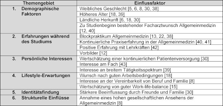 Die in der internationalen Literatur definierten Faktoren, die mit einem erhöhten Interesse an der Facharztweiterbildung Allgemeinmedizin verbunden sind, lassen sich in sechs Kategorien untergliedern [11]. Diese sind in Tabelle 1 [Tab. 1] dargestellt.